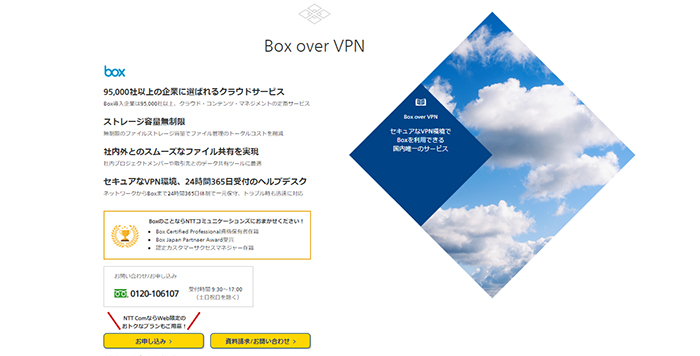NTTコミュニケーションズの「Box over VPN」は、セキュリティにこだわりたい企業におすすめのオンラインストレージです。他サービスと比較してコストは高めですが、豊富な機能とシステムの安定性から高く評価されています。一度に5GBまで使えるファイル共有や、7段階のアクセス権設定、illustratorのaiファイルなどもアプリなしで閲覧可能なプレビュー機能などは非常に便利です。管理者向けのアカウントやデバイスの管理機能や各種のログ取得機能、セキュリティポリシーの設定機能なども充実しています。