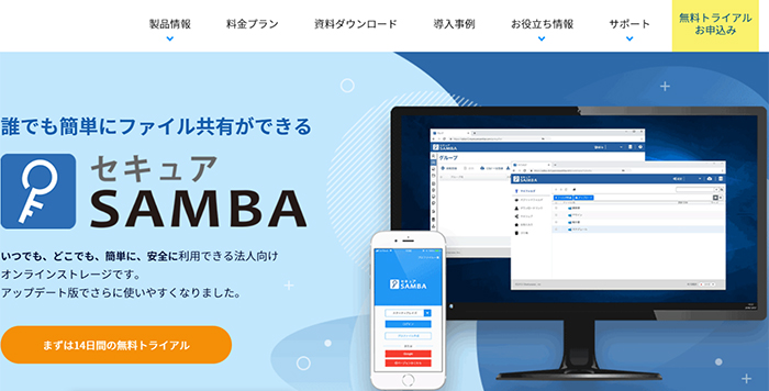 「セキュアSAMBA」はamazonのAWS(*1)で構築されたストレージサービスです。外付けのハードディスクやNAS(*2)の利用と同じ感覚でクラウド上のオンラインストレージを利用できます。暗号化通信を行いながらも、通信速度が安定しているほか、ビジネスで必要とされる機能が豊富です。名前が示すようにセキュリティには特に力を入れており、セキュリティトラブルの予防や緊急時の素早い対応が可能になっています。導入前後のサポートも専任の担当者が就いてくれるので安心です。