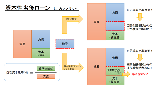 一方で、資本性劣後ローンで資金調達すると「資本(純資産)」となり、自己資本比率が悪化しないどころか、自己資本比率がむしろ改善するため、民間金融機関から追加融資も受けやすくなるのである。