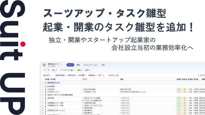 株式会社スーツは、表計算ソフトのような操作でチームの業務を「見える化」し、タスクの抜け漏れや期限遅れを防ぐタスク管理ツール「Suit UP」を展開しています。