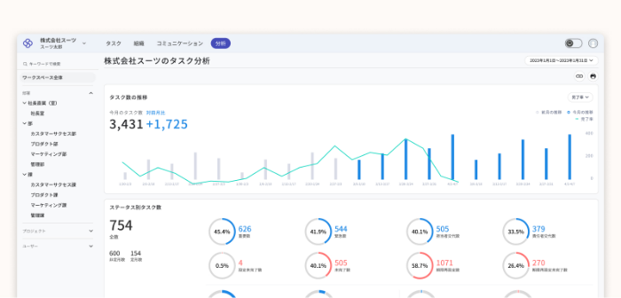 すでに機能として実装していますが、タスク量だけでなく、タスク設定のし直し率や、期限に間に合ったかどうかなども、個人単位・部署単位で統計データが取れるんです。