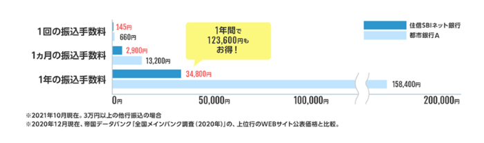 住信SBIネット銀行調べでは、とある都市銀行と比較すると年間12万円以上も振込手数料がおトクに。