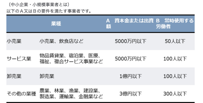 業務改善助成金の要件を例とした中小企業・小規模事業者の定義は以下のとおりです。