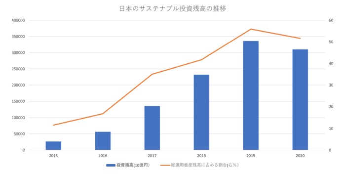 実際、世界のサステナブル投資額は年々増えています。また、日本のサステナブル投資残高の推移は以下のようになっています。