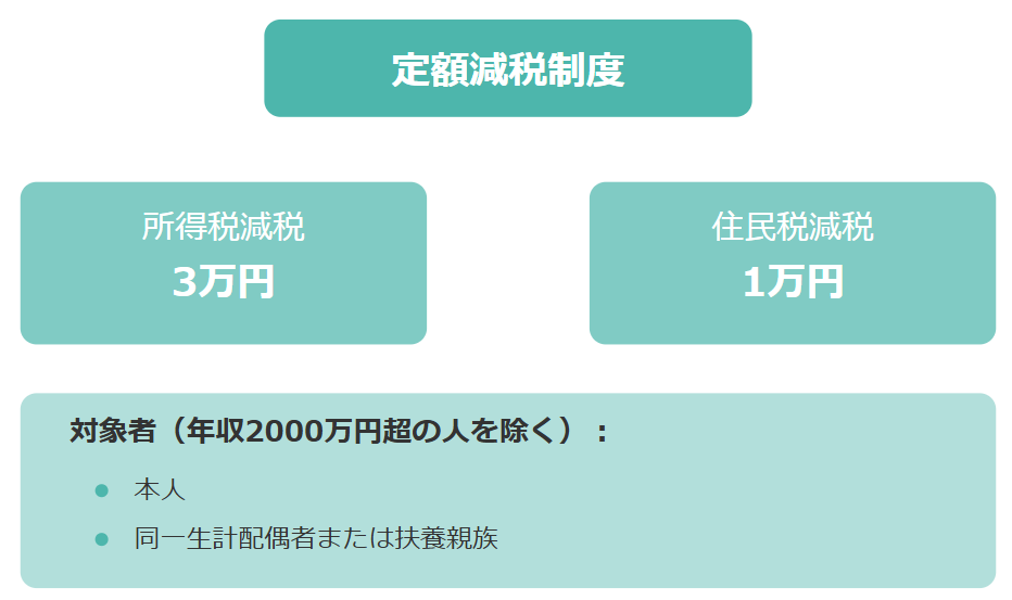 定額減税は、納税者本人および扶養家族一人につき、所得税3万円・住民税1万円の計4万円を減税する制度です。