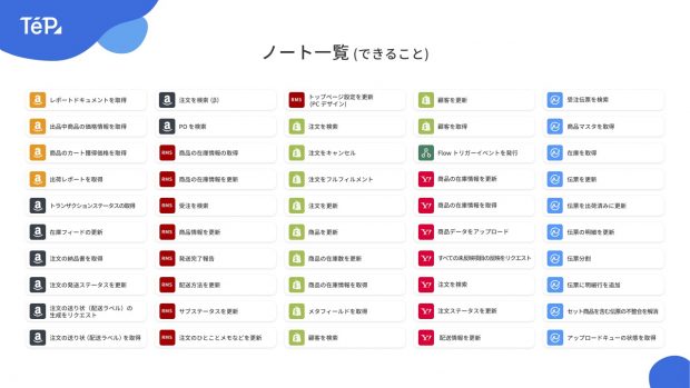 田渕:Amazonや楽天市場、ショッピファイなどさまざまなECプラットフォームと連携しています。ブロックを組み合わせることで、さまざまな業務を自動化することができます。