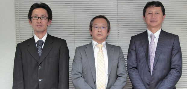 柳井社長をはさんで小松原会計事務所の小松原貴志顧問税理士(右)と藤井宏範監査担当