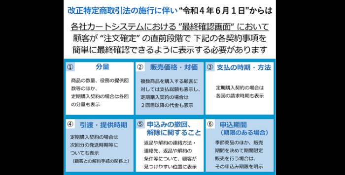 2022年6月1日に施行された改正特定商取引法に対応すべく、EC事業者様はECサイトの表示やレイアウトを適切に改修する必要があります。最終確認画面に法定の6項目を正しく記載し、総合的な観点から消費者を誤認させる内容や印象になっていないかをチェックしましょう。