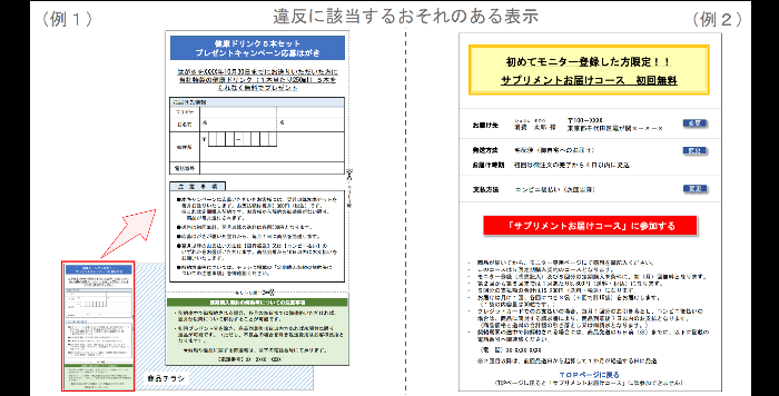 上記は違反の恐れのある表示ですが、どちらも「プレゼント」や「初回無料」といった文言が強調されている一方で、有償契約になる旨はそれらと離れた箇所に小さく書かれています。こうした表示では、消費者が無償契約であると誤認する可能性が十分に考えられるため、違反に該当する恐れがあります。