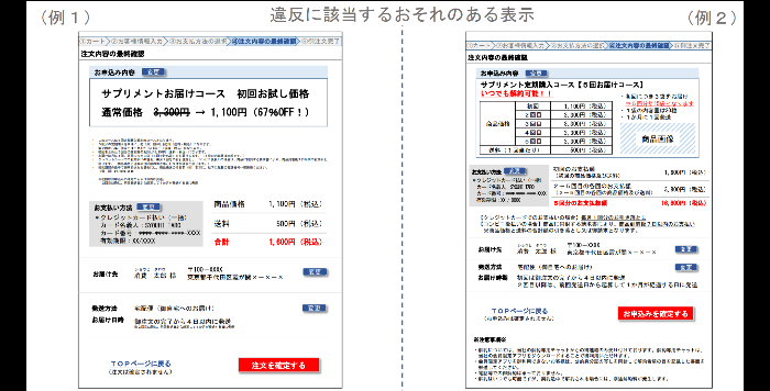 もうひとつは、先ほど挙げた最終確認画面に記載すべき6つの項目について、表示それ自体や表示の位置、形式、大きさ、色などが適切でなく、消費者が内容を誤認するような表示です。つまり最終確認画面で6項目を記載していたとしても、配置や文字サイズ、色使いなどが不適切であれば、違反に該当する恐れがあります。