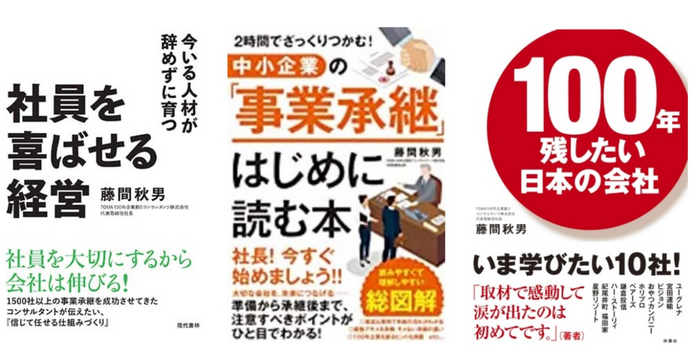 著書に『中小企業の「事業承継」はじめに読む本』(すばる舎)、『社長引退勧告』(幻冬舎)、『社員を喜ばせる経営』(現代書林)、『100年残したい日本の会社』(扶桑社)など。