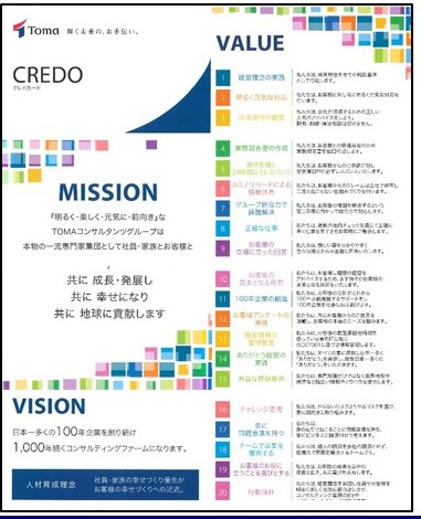 藤間:弊社では、月に1回、社員全員で理念と経営の勉強会を行っています。様々な経営の成功事例や失敗事例を共有し、常に「経営を最も重視し、永続企業という観点からアドバイスしなさい」と伝えています。また、「有用な情報を常に提供する」など15箇条のクレドカードを作成しています。その中には、お客様の立場に立った回答をし、お客様の見本となる経営をすることも明記しているので、弊社の経営について社員全員がお客様に伝えられるようになっています。