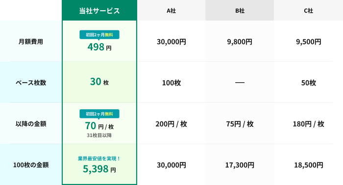 100枚あたりの金額で見ると5,398円で、数万円の費用が発生する他社とくらべて大幅に安いのが特徴です。枚数が増える場合の1枚当たりの追加費用も相対的に安いため、枚数が増えたときに大きなコストがかかることもありません。請求書関連業務を低コストで自動化できるのが、トラボックスの魅力です。