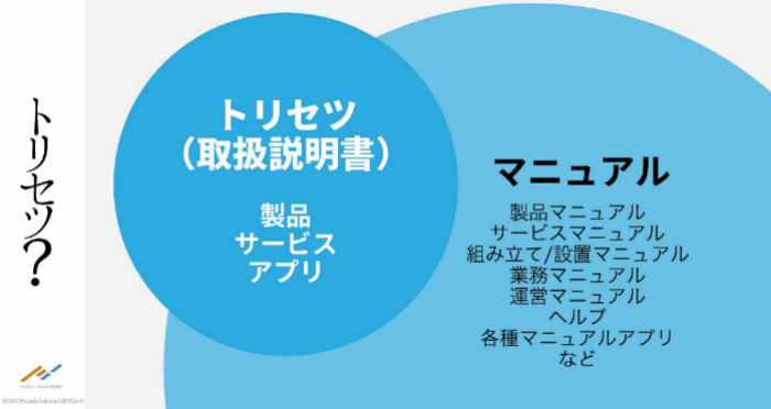 一言に「マニュアル」と言っても、社内の業務マニュアルから店舗などの運営マニュアルまで、さまざまなものがありますよね。その中でもトリセツは、製品やサービスアプリの取り扱い方法をまとめたものになります。