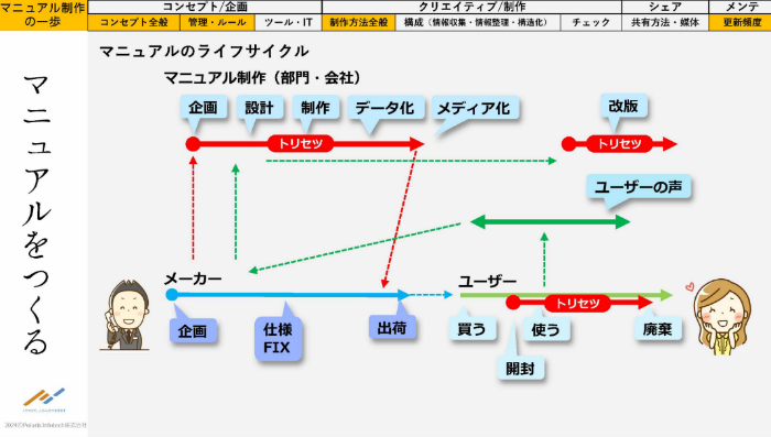 実はマニュアルにも、生まれてから死ぬまでのライフサイクルがあります。例えば製品のマニュアルであれば、製品が出荷されるまでの間に企画、設計、製作され、製品とともにユーザーの手元に届きます。そして、ユーザーが商品を使ったら廃棄されるようになります。しかしそこで終わりではなく、フィードバックされたユーザーの声を元に改善した「改版」が生まれています。