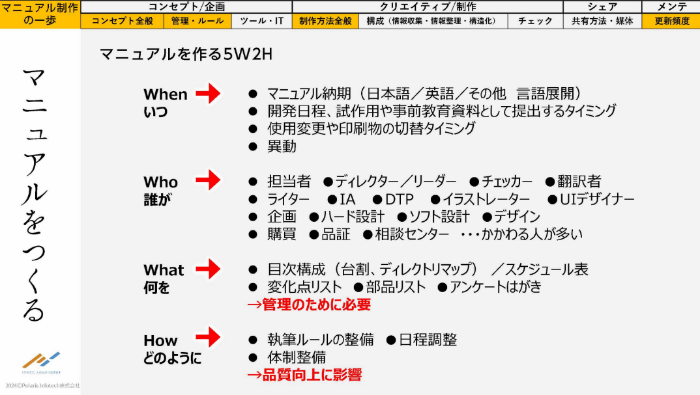 そして、マニュアルづくりをスタートするときには「5W2H」を意識するとわかりやすくなります。その中でも、管理に必要な「What(何を作るのか)」、品質向上に影響を与える「How(どのように作るのか)」は特に重要です。
