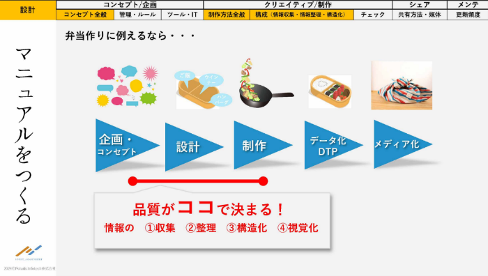 マニュアルづくりには、企画、設計、制作、データ化(DTPなど)、メディア化という流れがあります。それぞれを弁当作りに例えると、弁当箱に何を入れるのか、どんなふうに食材を入れるのかを考えるのが企画・設計。そして実際にごはんやおかずを作るのが制作、綺麗に盛り付けるのがデータ化、最後に弁当箱をパッケージにまとめるのがメディア化です。