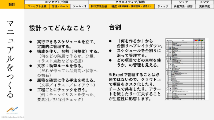 マニュアルの設計で行うのは、スケジュールを立てて定期的に管理をしたり、構成や台割を作ったり、きちんとした文章にするための執筆ルールを作ったりという作業です。台割という言葉は聞きなれないかもしれませんが、「何をどの階層、ストーリーで表現するのか」という「構成」を指します。台割の管理には、そのままリスト化やタスク化ができる「課題管理ツール」を使うと便利ですね。