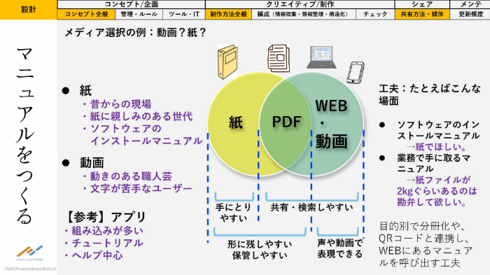 最近は「マニュアルを動画にした方がいいですか」という質問もいただくそうです。紙か動画かの境目は、実際に使われる場で求められる形をイメージするとわかりやすいと思います。