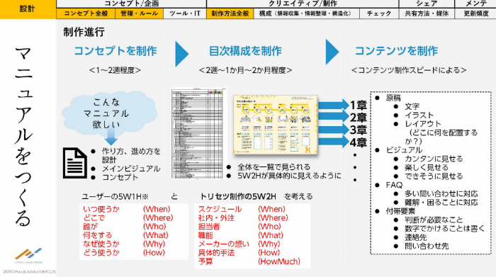 制作進行では、最初に「どういうマニュアルを作るか」というコンセプトを決めなければなりません。「こんなマニュアルがほしい」とイメージしてから、作り方や進め方を決める流れになります。