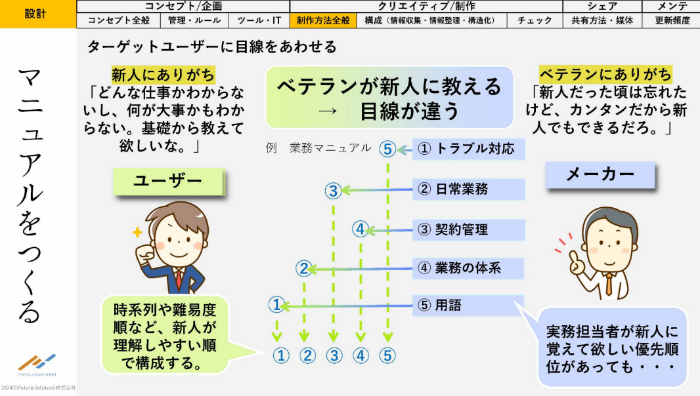ユーザーに目線をあわせるためには、まず「新人のころ何に困ったか」を思い出してみてください。一番困ったのは、それまでなじみのなかった業界用語ではないでしょうか。用語を覚えて、次に業務全体の流れを学び、その後ようやく細かい業務が頭に入るようになりましたよね。ベテランは「トラブル対応」「日常業務」など、新人にやってほしい業務から教えようとしがちですが、「用語」や「業務の体系」がわからないと新人も覚えられません。