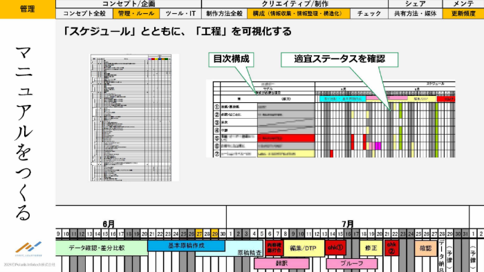 マニュアルの工程管理では、スケジュールと工程の可視化をします。実は、最終的に目次構成となる台割は、スケジュールと密接に関係をしています。ですから「データ確認・差分比較はこの期間でやります」と工程の可視化をすることが、見やすい台割にも繋がるんです。