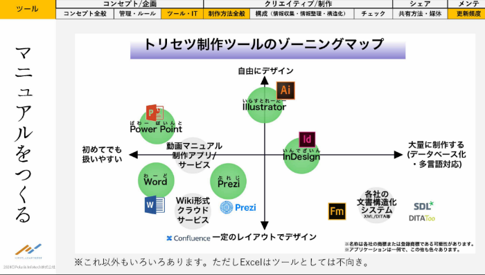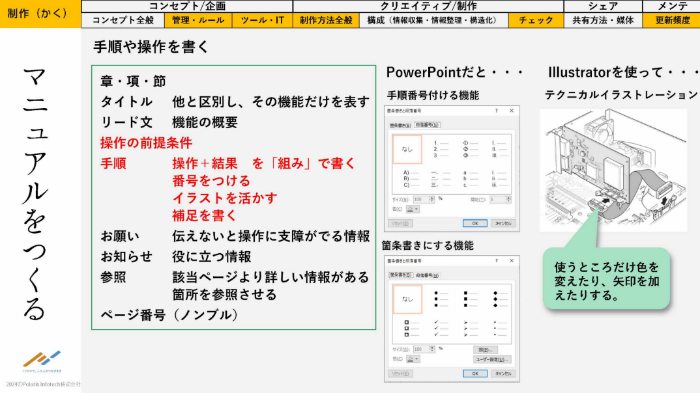 また、制作で使うツールは、WordやPowerPointが多いと思います。ちなみにExcelは制作には不向きです。表や図を正しく書くには良いのですが、マニュアル向けに最終の判型に合わせたり、コンテンツの管理が難しいからです。一斉に作業をしにくい点も、制作で使いにくい理由の1つですね。だから私が制作の際に一番使うのはPowerPointです。
