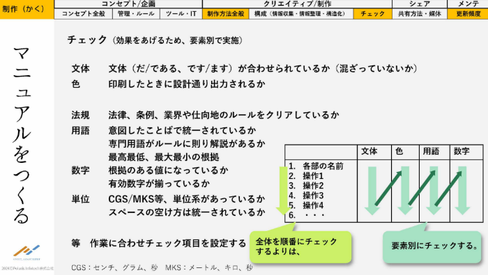 例えば、文字サイズやフォント、ですます調で書くのか、である調で書くのかといった文体や、操作の末尾は丸を打つのか打たないのか、といった部分です。