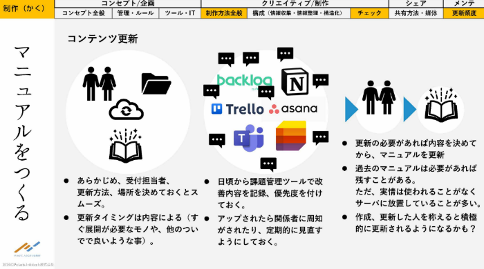 そしてマニュアルが完成した後も、定期的に更新していく必要があります。コンテンツ更新では、保管する場所やフォルダ、担当者などを決めておくことがスムーズに進めるポイントです。