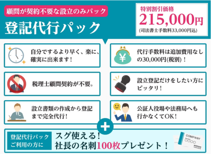こちらのプランでは司法書士に対する手数料にあたる33,000円(税込)がかかるものの、それ以外の追加費用は発生しません。なお、登記代行パックを利用すれば、登記後すぐに利用できる社長の名刺を100枚プレゼントします。