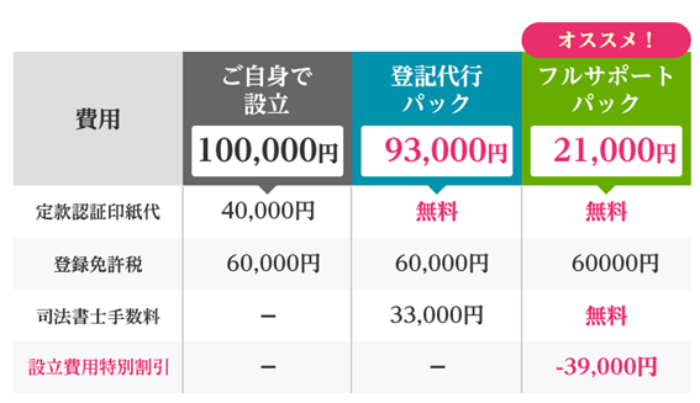 もともと株式会社と比較して設立費用が安く済む合同会社については、フルサポートパックなら21,000円(税込)で設立が可能です。