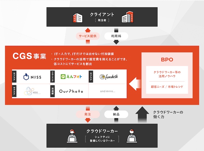 弊社が在宅ワーカーを活用してプロダクトを作り、企業に提供する。これがCGSです。今はこのCGSで生まれた事業が売上の柱になっています。