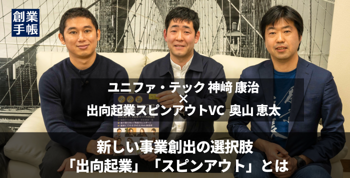 今回は「出向起業」「スピンアウト」をテーマに、ユニファ・テックの神﨑さん、出向起業スピンアウトキャピタルの奥山さんに、創業手帳の大久保がお話を伺いました。