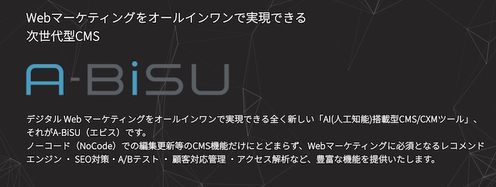 サービス業でホームページを使ってマーケティングをしたい方におすすめしたいのが、Webマーケティングをオールインワンで実現できる次世代型CMS「A-BiSU(エビス)」です。
