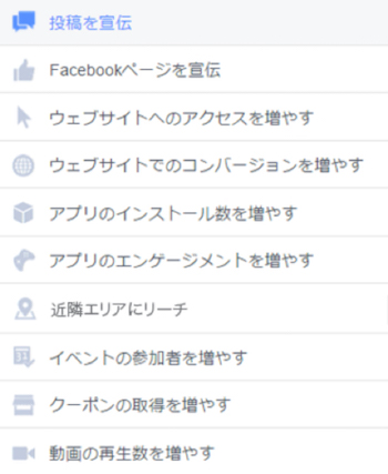 1つの広告セットの最低出稿金額は100円と少額から始めることができるうえ、サイトへのアクセス増加やアプリのインストール、動画再生回数の増加など、目的別に広告の種類が設定でき、効果的に宣伝することができます。