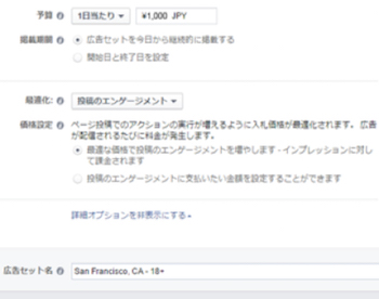 ターゲット層を選択したら、広告に名前をつけ、1日の予算または通算予算、掲載期間のスケジュールなどを設定します。
