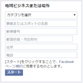 あなたのビジネスに一致するカテゴリを選択し、そのビジネスについての基本的な情報を入力。Facebookページ規約に同意したあとスタートをクリックします。