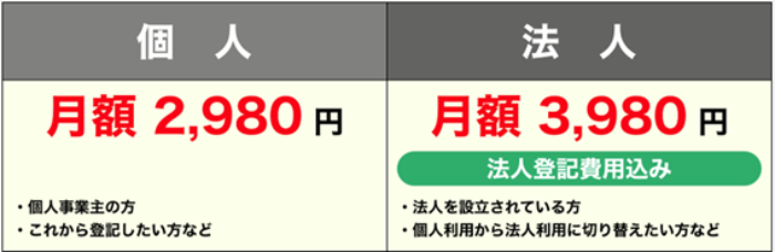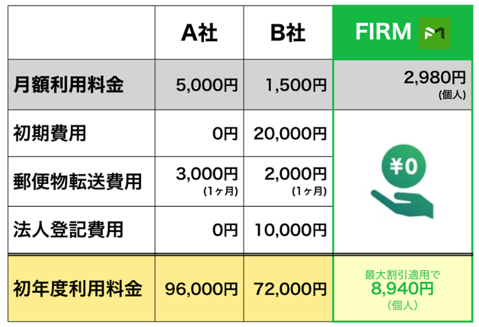 バーチャルオフィスFIRMは個人が月額2,980円、法人が法人登記にかかる費用を込みで3,980円とローコスト。