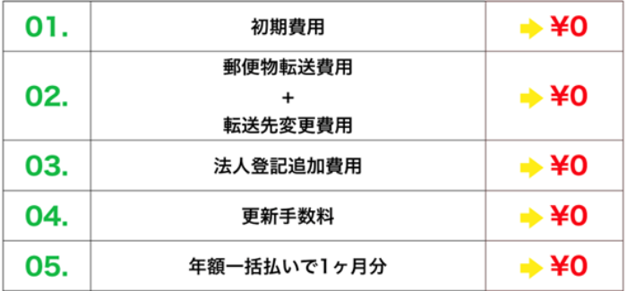 バーチャルオフィスFIRMは次の「5つの無料」が特徴です。