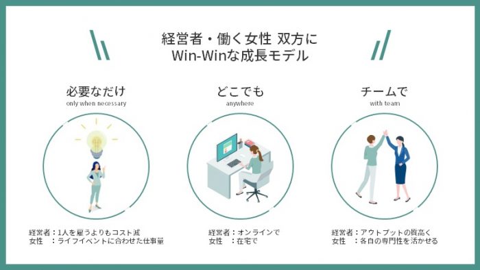 何か新しくチャレンジするためには、安心できるプラットフォームが必要です。業務委託の場合は、その人の過去の実績を見て案件を割り振ることがほとんどです。雇用型であれば、これまで経験がないことで苦手だと思っていたメンバーに、継続的なコミュニケーションの中で新しいことにチャレンジすることをリクエストできます。