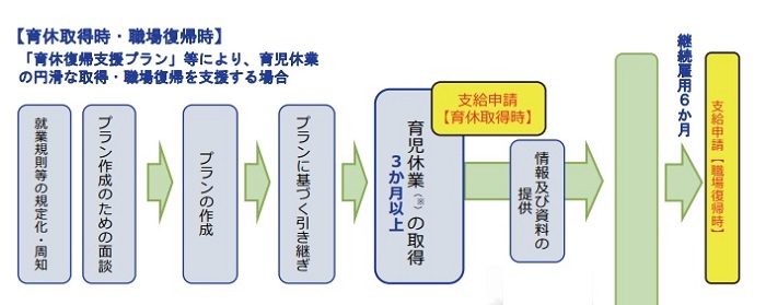 両立支援等助成金を申請する流れを「育児休業等支援コース(育休取得時)」の例で説明します。