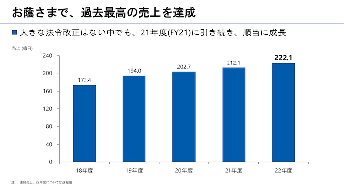 その後、話題は弥生の業績に移ります。ここ数年堅調に売上を拡大させており、22年度も21年度の212.1億円から222.1億円まで約10億円売上を伸ばされたことに触れました。またデスクトップアプリ・クラウドアプリ含めた登録ユーザー数も21年度の253.5万ユーザーから284.2万ユーザーまで成長しています。