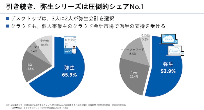 続いて、弥生シリーズは業務システム・クラウド会計システムともに圧倒的シェアNo.1を獲得している点を強調されました。デスクトップは3人に2人(65.9%)が弥生会計を選択、クラウドも、個人事業主のクラウド会計市場で過半数(53.9%)の指示を受けている調査結果に触れられています。