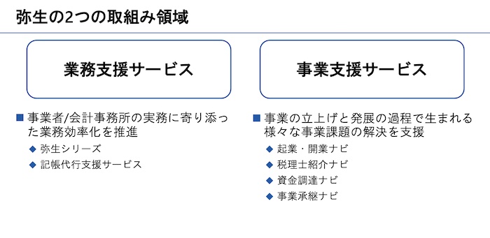 次に、岡本氏は弥生の事業領域について話されました。弥生の事業領域として、「業務支援サービス」と「事業支援サービス」の2つの領域があるとし、「業務支援サービス」には「弥生シリーズ」と「記帳代行支援サービス」、「事業支援サービス」には「起業・開業ナビ」「税理士紹介ナビ」「資金調達ナビ」「事業承継ナビ」の4つがあるとしました。従来は「業務支援サービス」を中心に事業展開されてきましたが、今後は「事業支援サービス」にも注力していくとのことです。