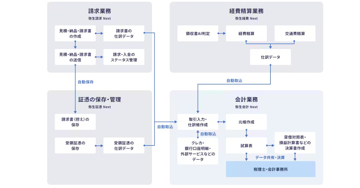 実は弥生会計 Next は、会計業務だけでなく、請求業務・経費精算・証憑管理まで1つのサービスで対応できます。これらのデータはすべて自動で連携されるため、入力の手間やミスを減らしながら、バックオフィス全体の効率化を図れます。参考画像※3