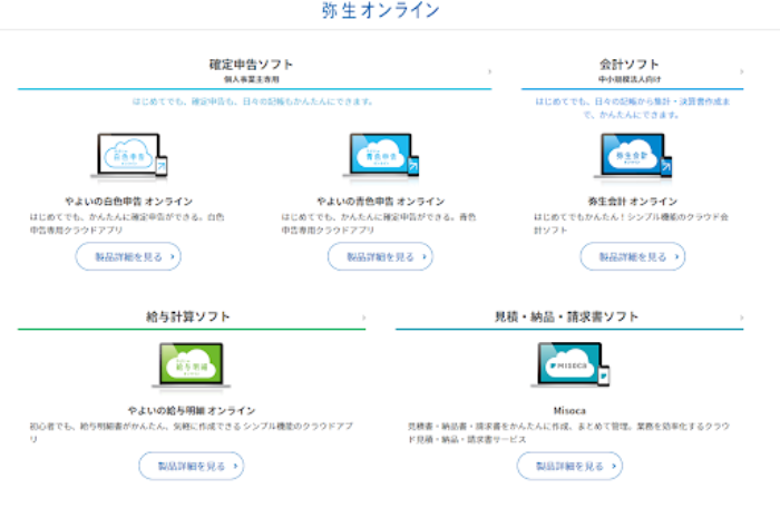 一方、クラウドアプリは、「弥生オンラインシリーズ」として販売されています。デスクトップアプリと同様に、個人事業主向けの「やよいの青色申告オンライン」、中小企業向けの「弥生会計オンライン」といったソフトがラインナップされています。