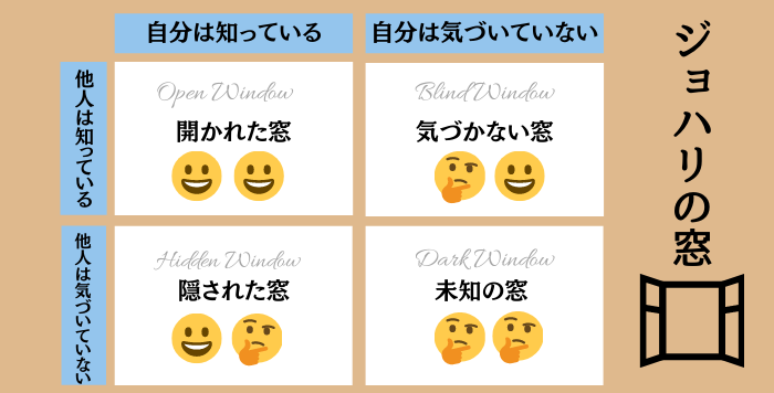 他にも、第三者の評価を利用した自己分析の手法「ジョハリの窓」を利用してみることもできます。ジョハリの窓は、自分が知っている/いない、他人が知っている/いないを組み合わせた4象限に分けて、それぞれの象限ごとにあてはまる性格や資質を交換することで、他人が知っていて、自分が知らない部分を発見するためのものです。