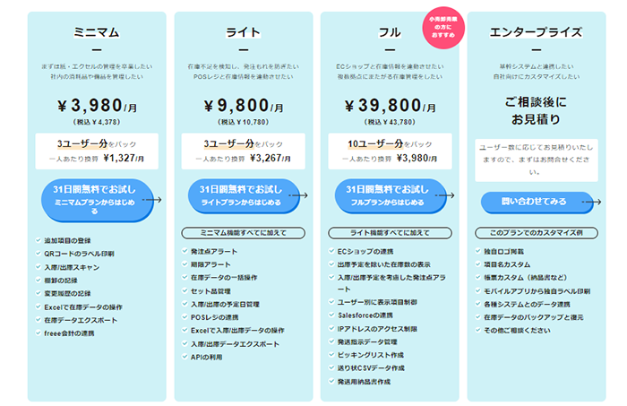 zaicoには、無料・ミニマム・ライト・フル・エンタープライズの4つのプランがあります。