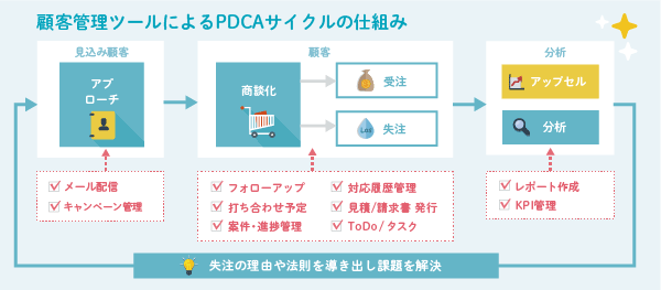 伸びる会社は経営を”なんとなく”で行なわず、いわゆる「PDCA(計画→実行→評価→改善)」を必ず実践して戦略的に動いている。その基となるデータを収集し分析することが、顧客管理の本質と言える。誰がどの顧客にどういった商談をしているのかを把握し、成功もしくは失敗の原因はどこにあるのかを分析することで、会社に最適な営業プロセスを導き出す。これからの経営者に必須のツールだ。